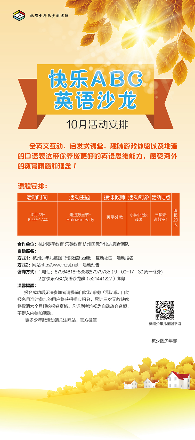 1.活动主题:走进万圣节-Halloween Party 2.活动时间:2016年10月22日16:00-17:00 3.活动地点:三楼培训教室14.活动内容:(1)开场介绍万圣节历史。(2)趣味单词(Ghost幽灵,Zombie僵尸,Mummy木乃伊,Alien外星人,monster怪物,Vampire吸血鬼,Witch巫婆)。(3)游戏:妙投乒乓球、木乃伊游戏,气球大作战。(4)活动总结所学内容。本活动适合小学中低段读者参加。