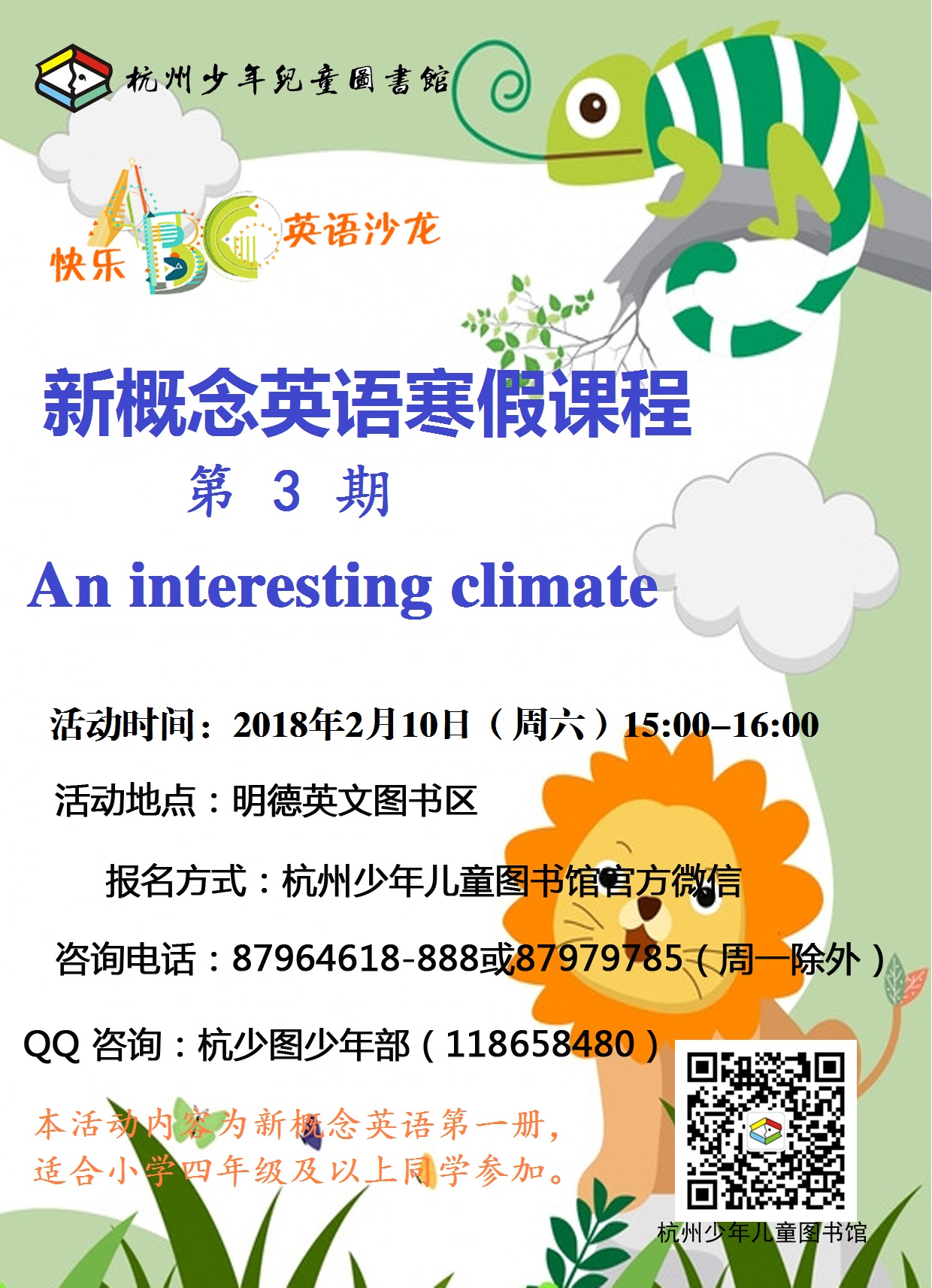 | 2018年2月10日15:00-16:00快乐ABC英语沙龙-新概念英语寒假课程第三期