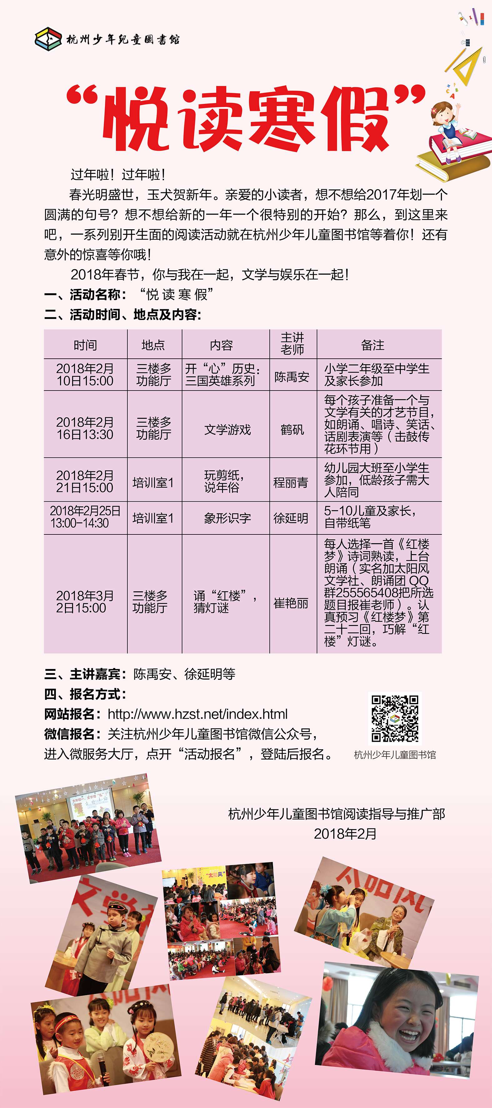 春光明盛世,玉犬贺新年。亲爱的小读者,想不想给2017年划一个圆满的句号?想不想给新的一年一个很特别的开始?那么,到这里来吧,一系列别开生面的阅读活动就在杭州少年儿童图书馆等着你!还有意外的惊喜等你哦!