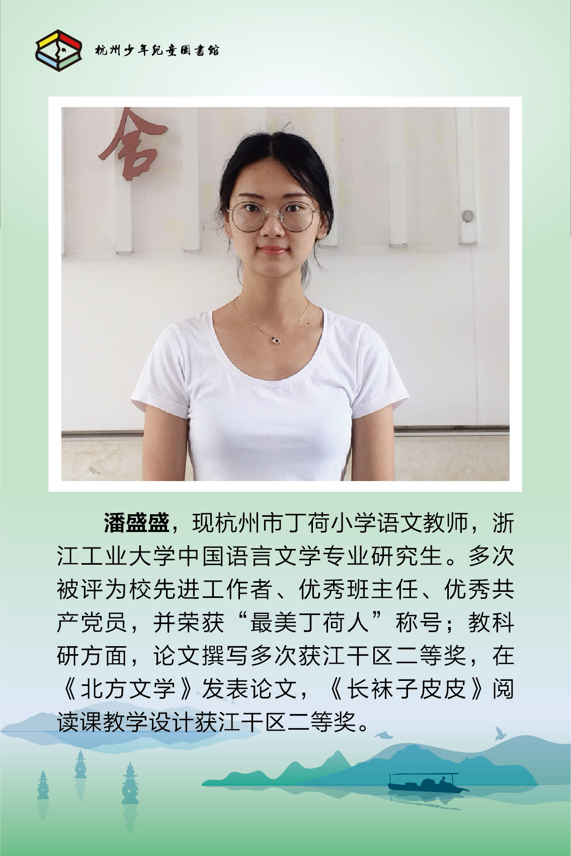 潘盛盛,现杭州市丁荷小学语文教师,浙江工业大学中国语言文学专业研究生。多次被评为校先进工作者、优秀班主任、优秀共产党员,并荣获“最美丁荷人”称号;教科研方面,论文撰写多次获江干区二等奖,在《北方文学》发表论文,《长袜子皮皮》阅读课教学设计获江干区二等奖。