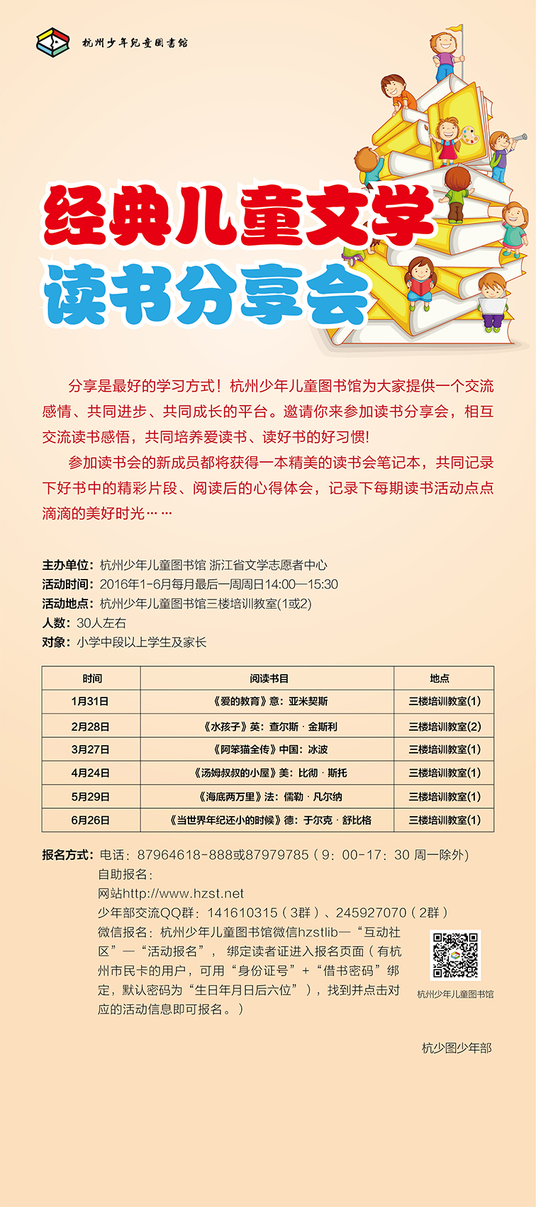 一、主办单位:杭州少年儿童图书馆 浙江省文学志愿者中心 二、活动时间:2016年1-6月每月最后一周周日14:00—15:30三、活动地点:杭州少年儿童图书馆三楼培训教室(1或2)四、人数:30人左右五、对象:小学中段以上学生及家长六、每月读书分享会安排:时间 阅读书目 地点1月31日 《爱的教育》意:亚米契斯 三楼培训教室(1)七、报名方式:电话:87964618-888或87979785(9:00-17:30 周一除外)自助报名:网站http://www.hzst.net少年部交流QQ群:141610315(3群)、245927070(2群)微信报名:杭州少年儿童图书馆微信hzstlib—“互动社区”—“活动报名”, 绑定读者证进入报名页面(有杭州市民卡的用户,可用“身份证号”+“借书密码”绑定,默认密码为“生日年月日后六位”),找到并点击对应的活动信息即可报名。)