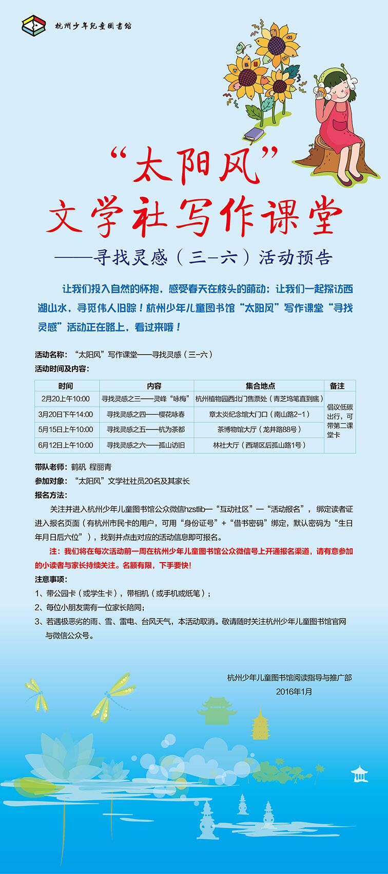 活动预告让我们投入自然的怀抱,感受春天在枝头的萌动;让我们一起探访西湖山水,寻觅伟人旧踪!杭州少年儿童图书馆“太阳风”写作课堂“寻找灵感”活动正在路上,看过来哦!一、活动名称:“太阳风”写作课堂——寻找灵感三——灵峰“咏梅”。二、活动时间及内容:1、2月20上午10:00 要求每位报名成功的社员提前准备一首有关“梅花”的古诗词或原创童诗,朗诵团团员可提前得到老师指导,参加现场朗诵表演。2、集合地点:杭州植物园西北门售票处(青芝坞笔直到底) 三、带队老师:鹤矾 程丽青四、参加对象:“太阳风”文学社社员20名及其家长五、报名方法:关注并进入杭州少年儿童图书馆公众微信hzstlib—“互动社区”—“活动报名”, 绑定读者证进入报名页面(有杭州市民卡的用户,可用“身份证号”+“借书密码”绑定,默认密码为“生日年月日后六位”),找到并点击对应的活动信息即可报名。注:“太阳风”文学社写作课堂——寻找灵感(三-六)系列活动时间与内容已排出,敬请关注杭少图官网或杭少图场馆内现场海报。我们将在每次活动前一周在杭州少年儿童图书馆公众微信号上开通报名渠道,请有意参加的小读者与家长持续关注。名额有限,下手要快!六、注意事项:1、倡议低碳出行,可带第二课堂卡;2、带公园卡(或学生卡),带相机(或手机或纸笔);3、每位小朋友需有一位家长陪同;4、若遇极恶劣的雨、雪、雷电、台风天气,本活动取消。敬请随时关注杭州少年儿童图书馆官网与微信公众号。杭州少年儿童图书馆阅读指导与推广部 2016年1月
