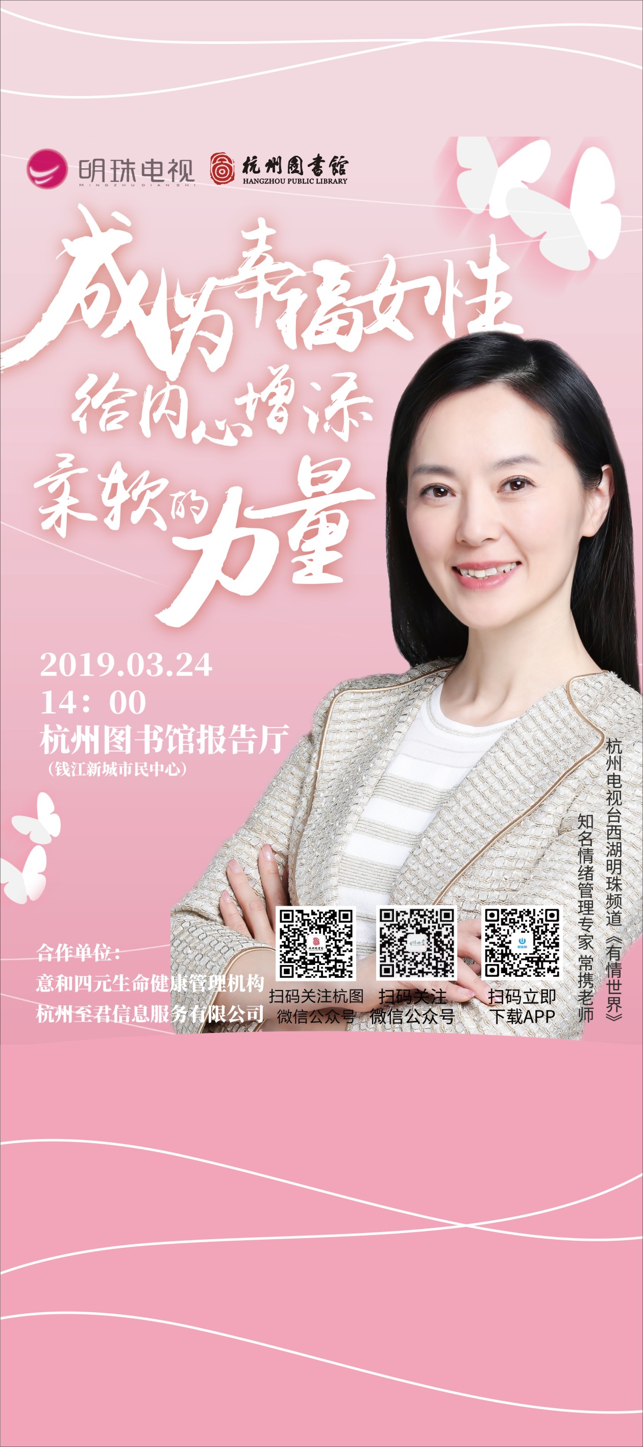 女性内心柔软的力量,在家庭关系和亲子关系中可以化解很多烦恼,在职场中用以柔克刚的能力,让自己游刃有余。挖掘女性内在的柔美为自己打造更舒适的情绪空间,也是一种宝贵的精神财富,杭州图书馆文澜大讲堂“女神月”特别活动,联合杭州电视台西湖明珠频道,共同探讨女性情绪的管理,分享女性宝贵的财富力量。