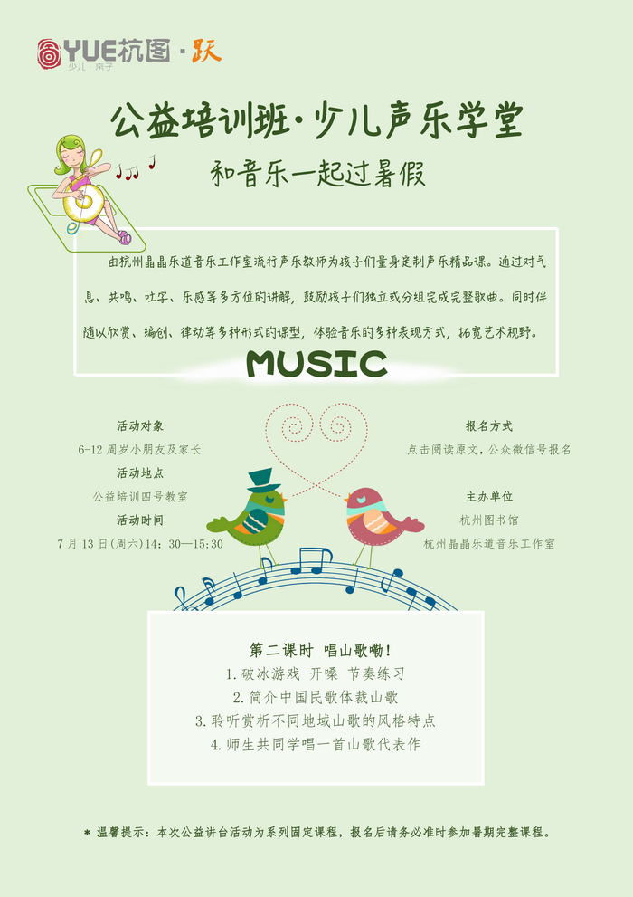 | 【YUE杭图•跃】『公益培训班·少儿声乐学堂』和音乐一起过暑假