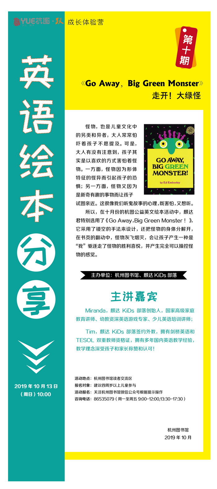 | 活动时间: 2019年10月13日(周日) 10:00 ~ 11:30 |