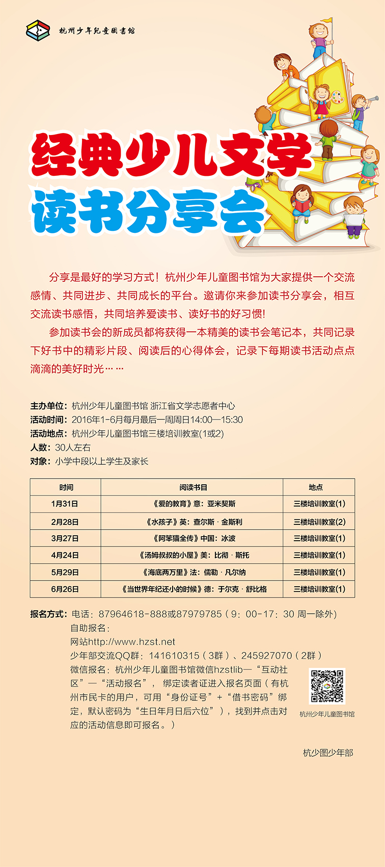 一、主办单位:杭州少年儿童图书馆 浙江省文学志愿者中心 二、活动时间:2016年1-6月每月最后一周周日14:00—15:30三、活动地点:杭州少年儿童图书馆三楼培训教室(1或2)四、人数:30人左右五、对象:小学中段以上学生及家长六、每月读书分享会安排: 5月29日14:00-15:30 《海底两万里》法:儒勒•凡尔纳 三楼培训教室(1)七、报名方式:电话:87964618-888或87979785(9:00-17:30 周一除外)自助报名:网站http://www.hzst.net少年部交流QQ群:141610315(3群)、245927070(2群)微信报名:杭州少年儿童图书馆微信hzstlib—“互动社区”—“活动报名”, 绑定读者证进入报名页面(有杭州市民卡的用户,可用“身份证号”+“借书密码”绑定,默认密码为“生日年月日后六位”),找到并点击对应的活动信息即可报名。)
