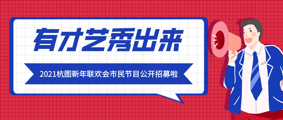 为了迎接崭新的一年,展现和回顾2020年感动的故事,进一步弘扬中华民族优秀传统文化,丰富节日期间市民文化生活,营造欢乐祥和、和谐文明的节日氛围。都市快报与杭州图书馆特此举办“让爱延续,温暖杭城”为主题的联欢演出,加深与市民读者的情感交流。我们不仅为市民带来精心准备的节目,也将对外公开招募5个市民节目,让我们的演出更加丰富多彩。现就征集事宜进行如下安排: