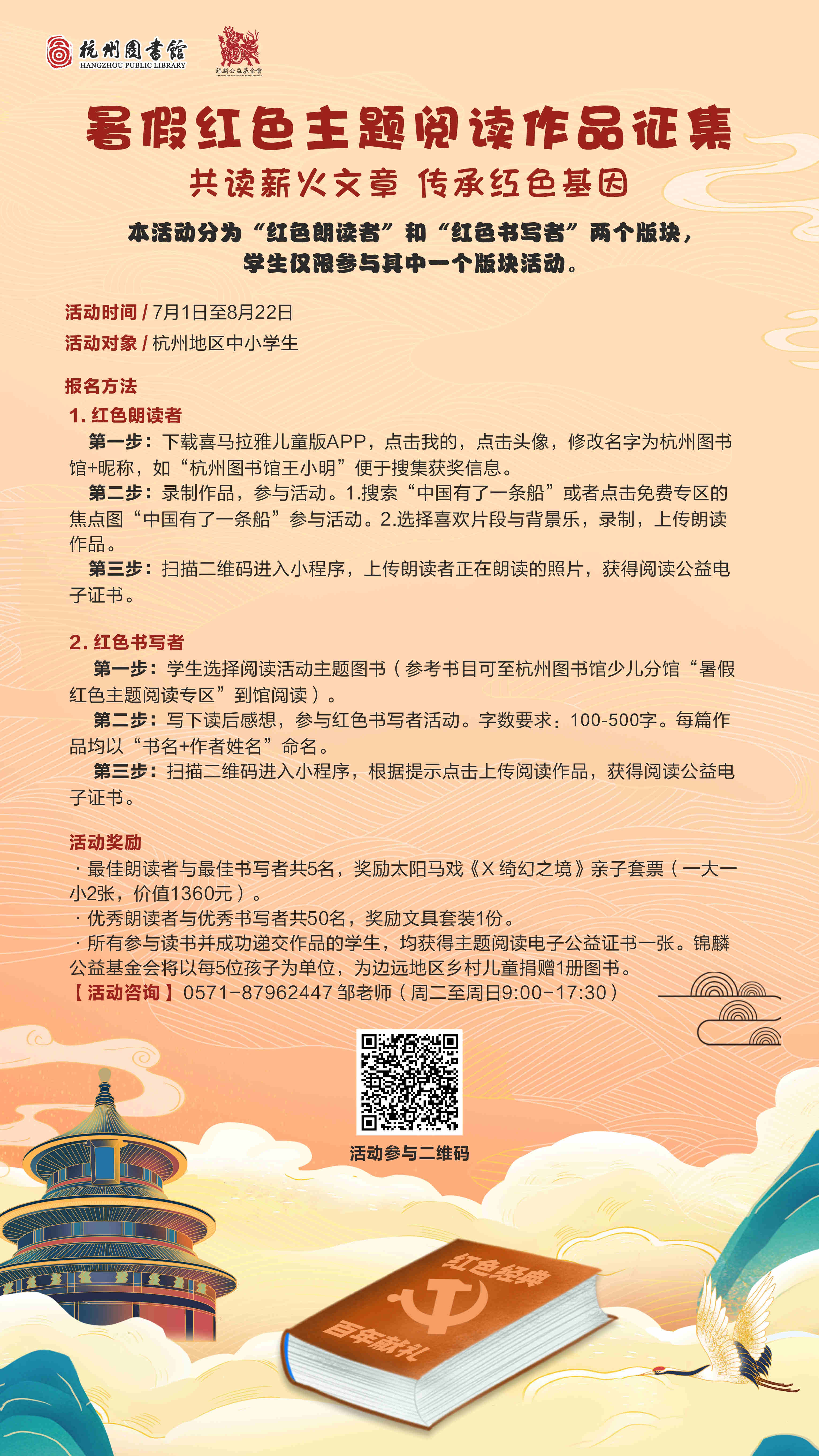 第一步:学生选择阅读活动主题图书(参考书目可至杭州图书馆少儿分馆“暑假红色主题阅读专区”到馆阅读)。 第二步:写下读后感想,参与红色书写者活动。字数要求:100-500字。每篇作品均以“书名+作者姓名”命名。 第三步:扫描二维码进入小程序,根据提示点击上传阅读作品,获得阅读公益电子证书。 |