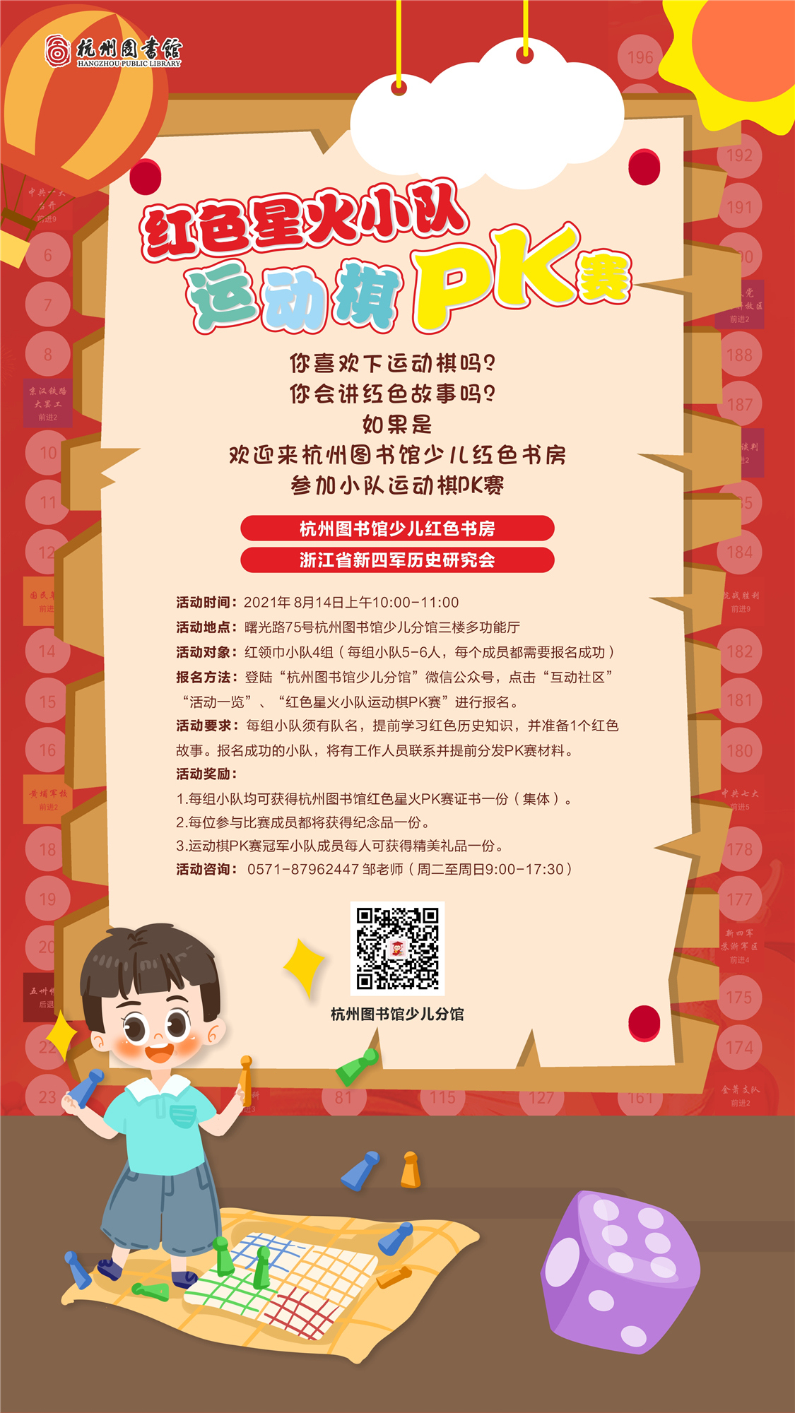报名方法:登陆“杭州图书馆少儿分馆”微信公众号,点击“互动社区” 、“活动一览”、“红色星火小队运动飞行棋PK赛”进行报名。