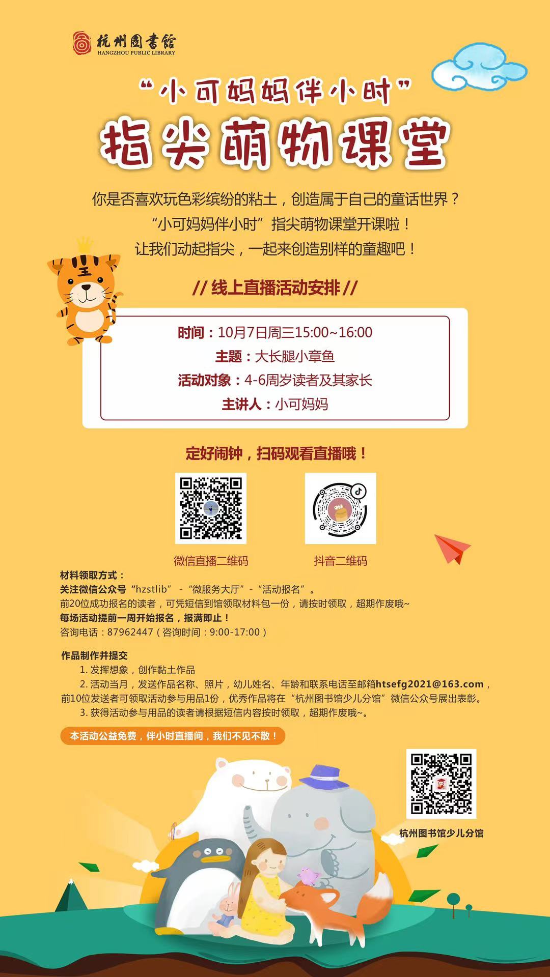 报名成功的读者请于10月6日上午10:00-11:30至杭州图书馆少儿分馆(曙光路75号)一楼低幼区服务台领取活动材料包