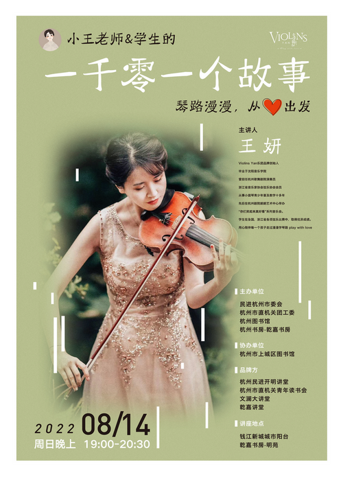 主讲嘉宾:王妍,Violins Yan乐团品牌创始人,毕业于沈阳音乐学院。曾担任杭州歌舞剧院演奏员、浙江省音乐家协会弦乐协会会员,从事小提琴青少年普及教学十多年。