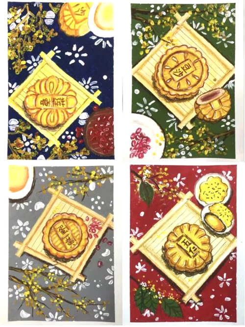 艺术技法:创作时以马克笔和颜料结合,完成专属的月饼设计。