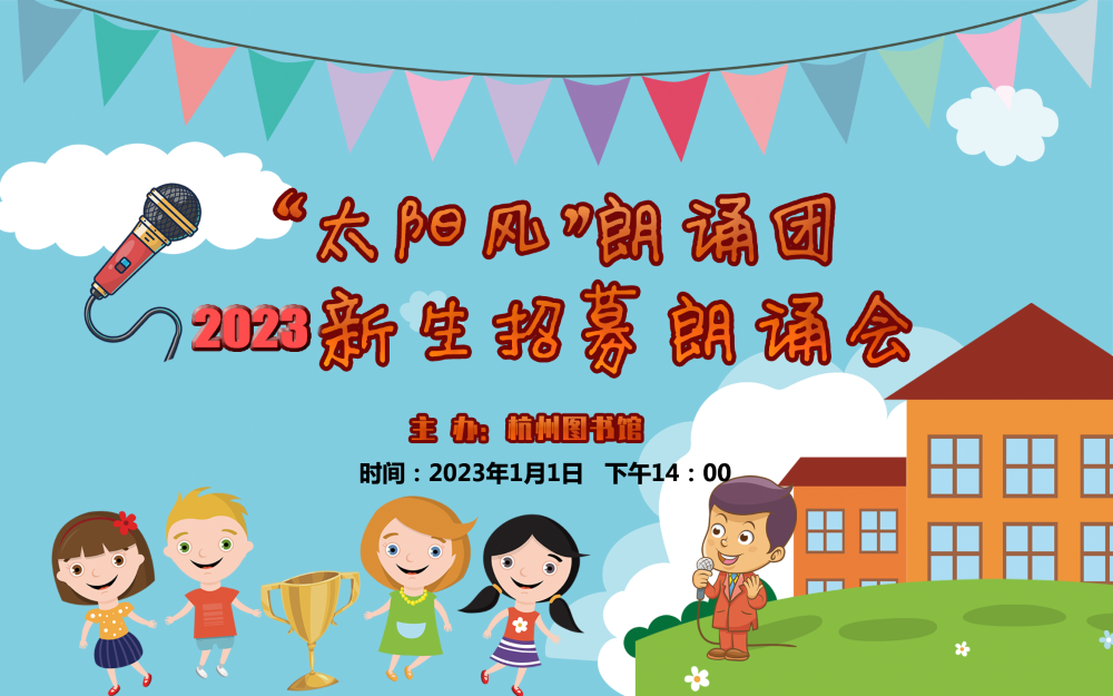 让更多的孩子得以快乐阅读、激情朗诵,杭州图书馆“太阳风”朗诵团2023年新生招募又将开始!注意注意:一旦你加入了“太阳风”朗诵团,你就有机会得到知名专家的指点与培训;你的声音就有可能以二维码的形式在全国各类少儿杂志上发表,或是被录成音频在杭州图书馆的微信公众号上广为传播!