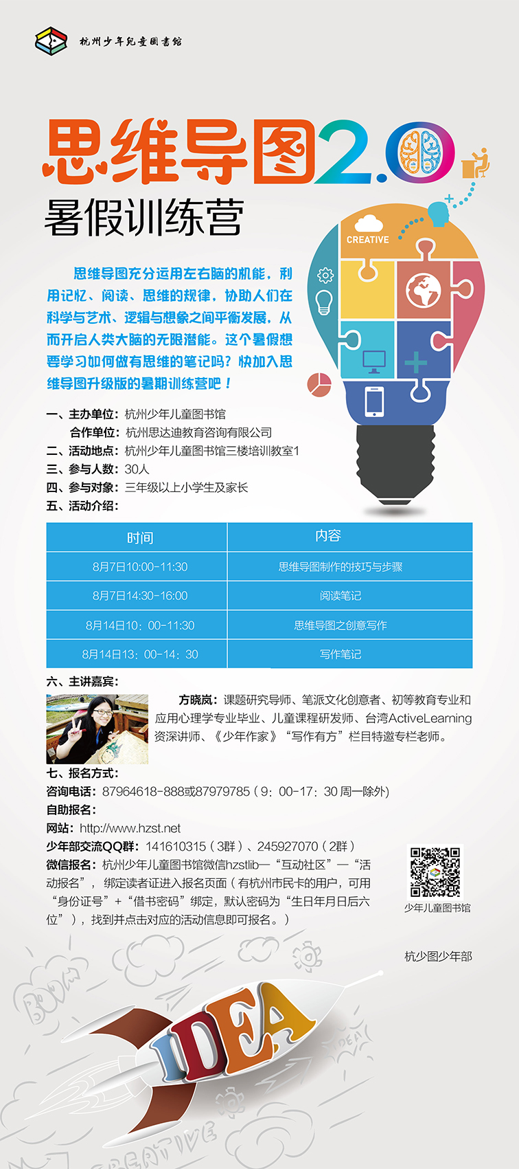 一、主办单位:杭州少年儿童图书馆 合作单位:杭州思达迪教育咨询有限公司 二、活动地点:杭州少年儿童图书馆三楼培训教室1三、参与人数:30人四、参与对象:三年级以上小学生及家长