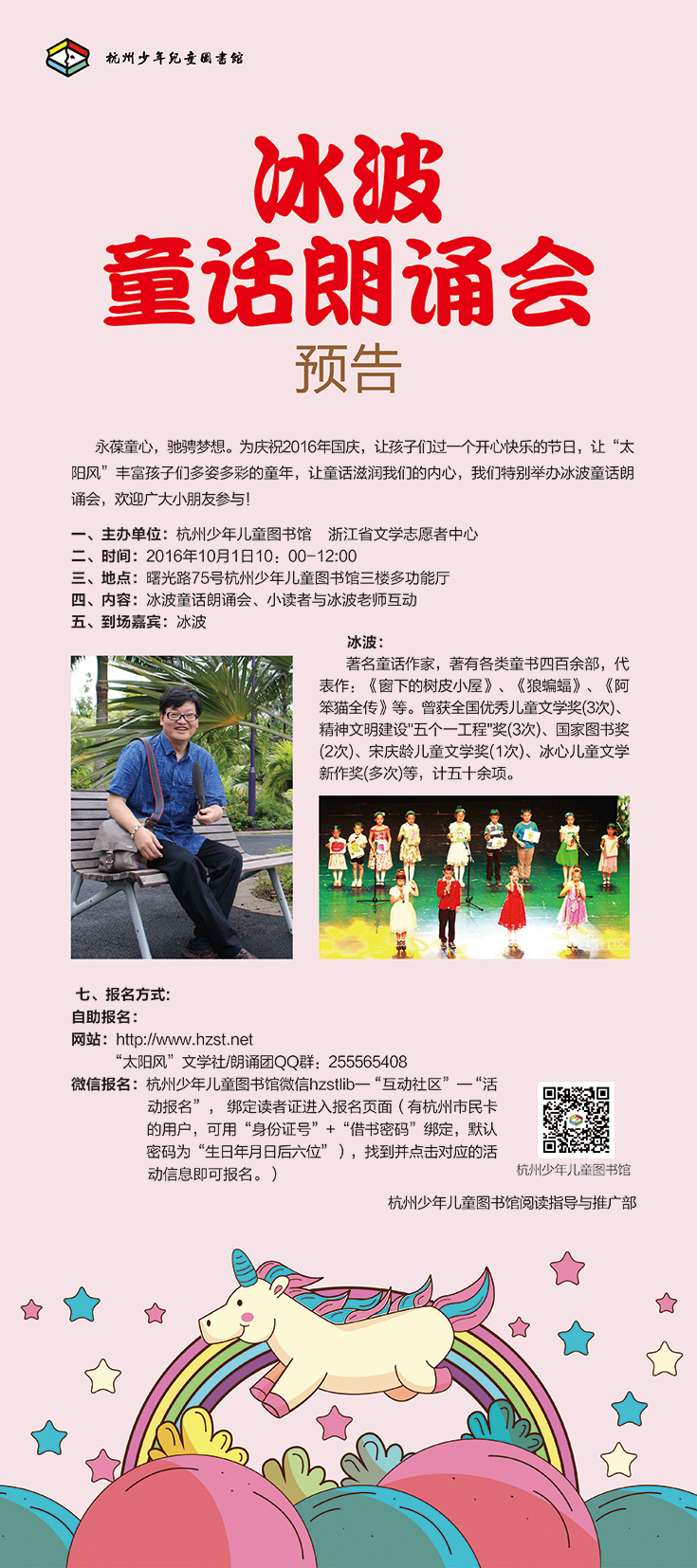永葆童心,驰骋梦想。为庆祝2016年国庆,让孩子们过一个开心快乐的节日,让“太阳风”丰富孩子们多姿多彩的童年,让童话滋润我们的内心,我们特别举办冰波童话朗诵会,欢迎广大小朋友参与!一、时间:2016年10月1日上午10:00二、地点:曙光路75号杭州少年儿童图书馆三楼多功能厅三、内容:冰波童话朗诵会四、到场嘉宾:冰波冰波:著名童话作家,著有各类童书四百余部,代表作:《窗下的树皮小屋》、《狼蝙蝠》、《阿笨猫全传》等。曾获全国优秀儿童文学奖(3次)、精神文明建设'五个一工程'奖(3次)、国家图书奖(2次)、宋庆龄儿童文学奖(1次)、冰心儿童文学新作奖(多次)等,计五十余项。五、主办单位:杭州少年儿童图书馆浙江省文学志愿者中心