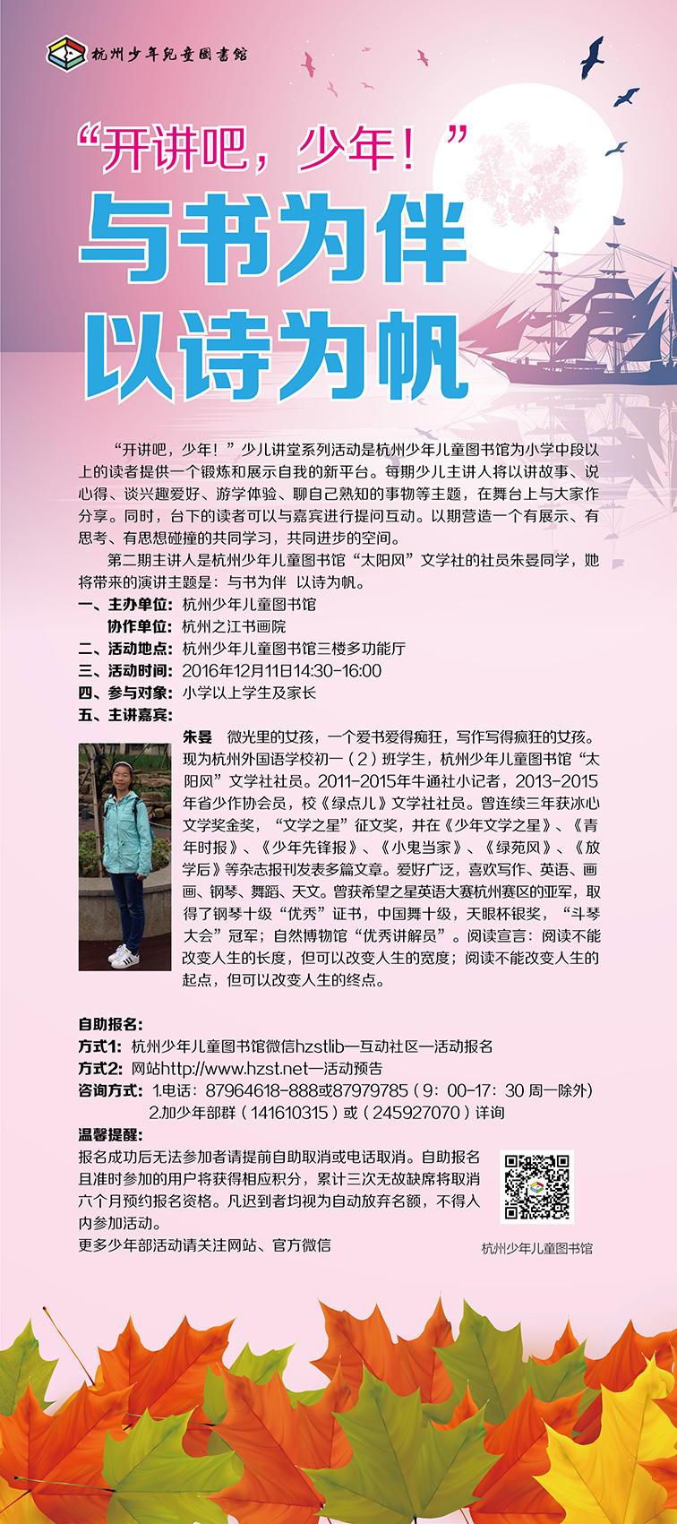 活动地点:曙光路75号杭州少年儿童图书馆三楼多功能厅