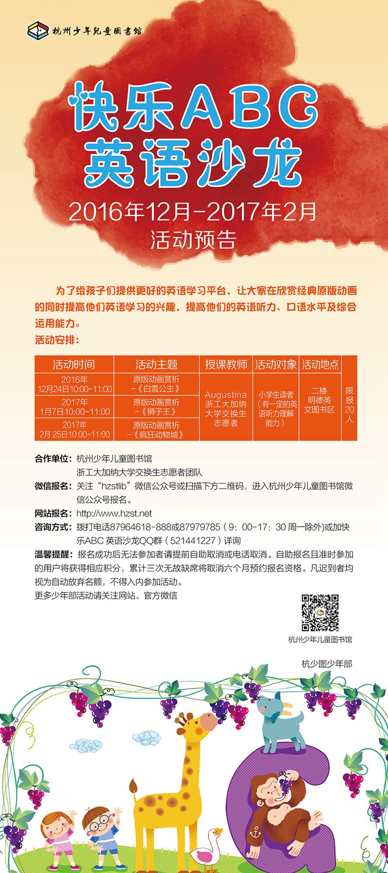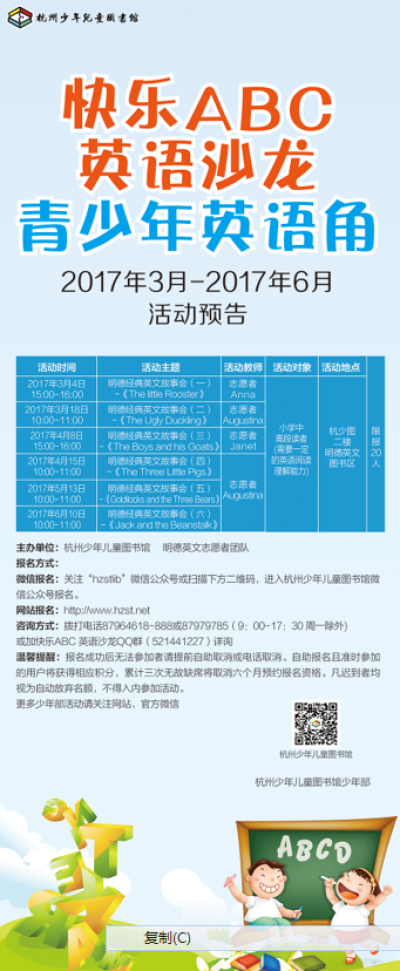 活动地点:杭州少年儿童图书馆二楼明德英文图书区