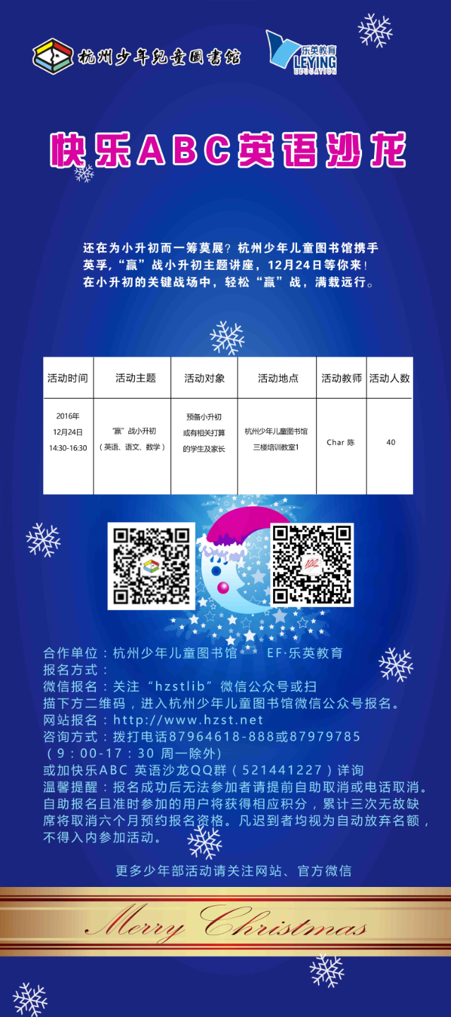 活动地点:杭州少年儿童图书馆二楼少年部明德英文图书区