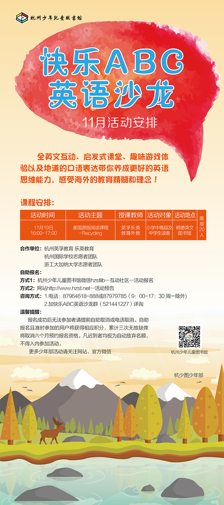 活动地点:杭州少年儿童图书馆二楼少年部明德英文图书区